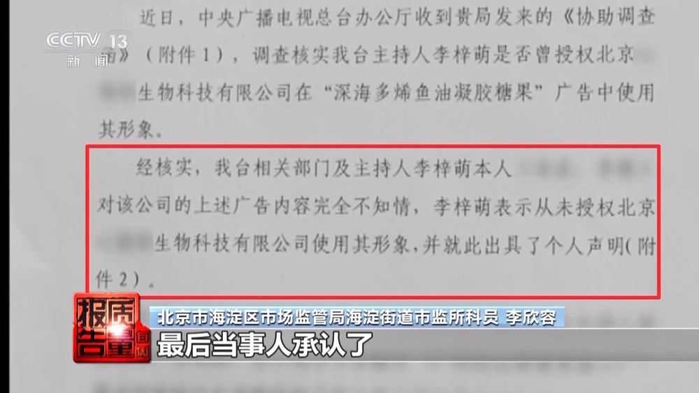 北京市海淀区市场监督管理部门经过向中央广播电视总台核实,最终确认,总台主持人李梓萌从未代言这款鱼油产品,也未授权使用其形象进行宣传。